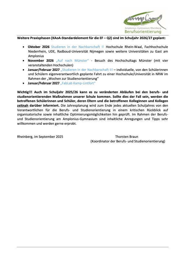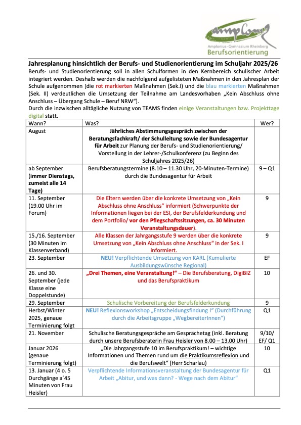 Die Jahresplanung wird zum Ende jedes aktuellen Schuljahres von den Verantwortlichen für die Berufs- und Studienorientierung in einem kritischen Rückblick auf organisatorische sowie inhaltliche Optimierungsmöglichkeiten hin geprüft. Im Rahmen der Berufs- und Studienorientierung am Amplonius-Gymnasium sind inhaltliche Anregungen und Tipps sehr willkommen und werden gerne erprobt.
