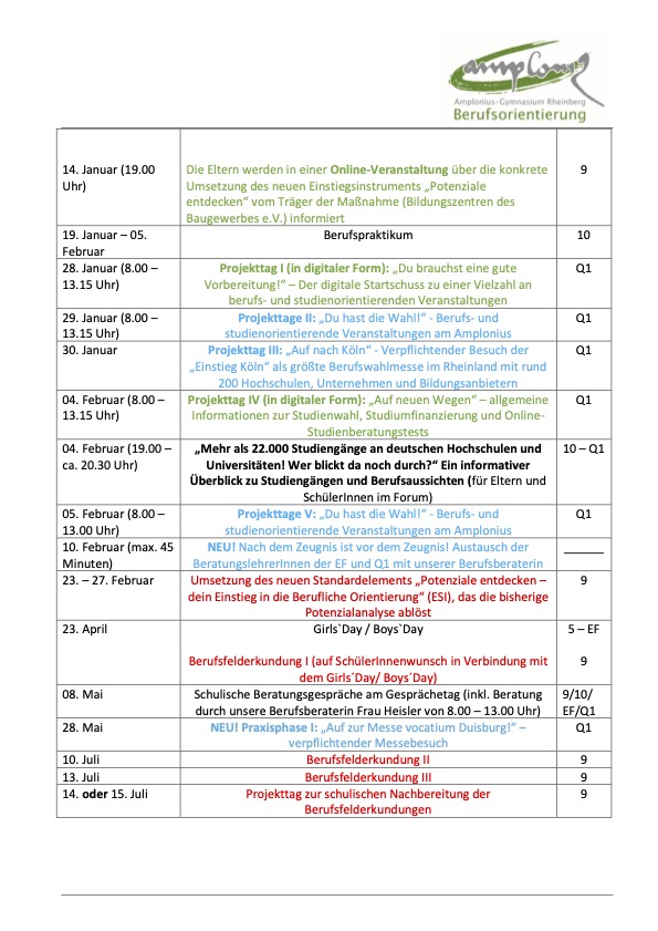 Wichtig! Auch in diesem Schuljahr kann es zu veränderten Abläufen bei den berufs- und studienorientierenden Maßnahmen unserer Schule kommen. Sollte dies der Fall sein, werden die betroffenen Schüler:innen, deren Eltern und die betroffenen Kolleg:innen zeitnah darüber informiert.