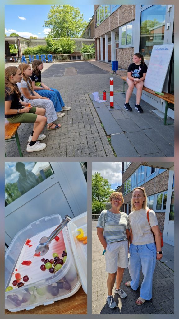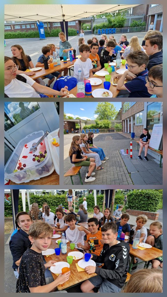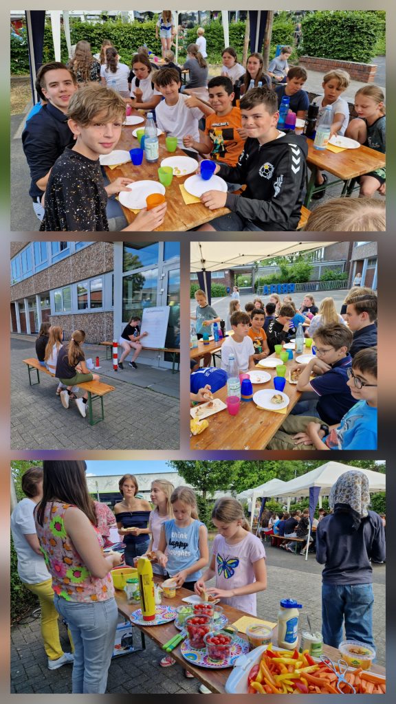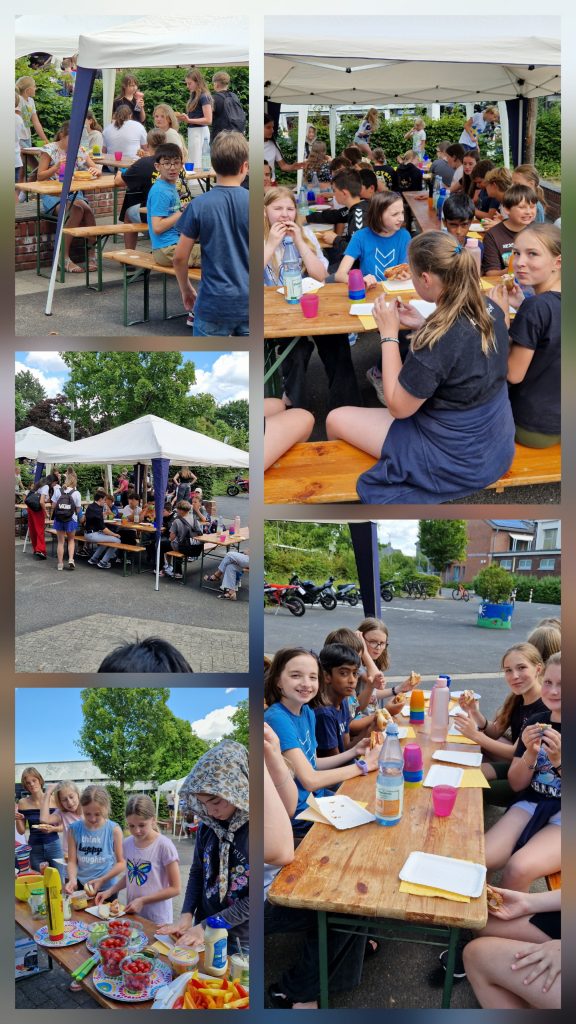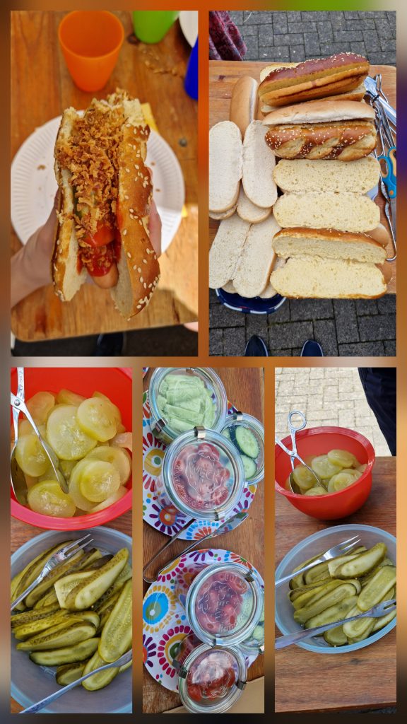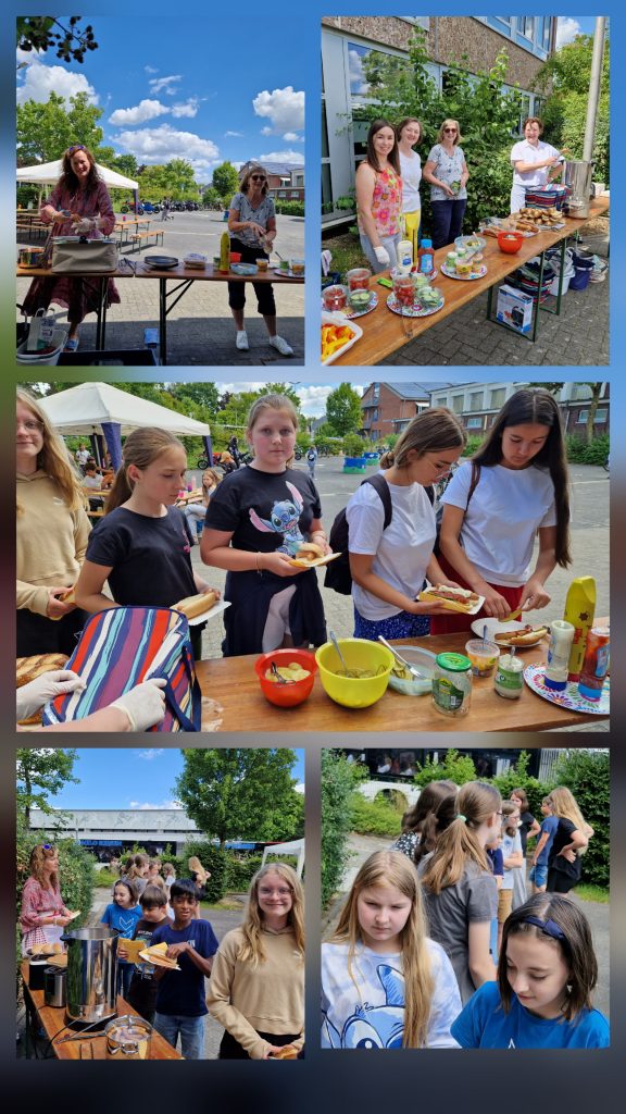 Wir feiern gern und essen tun wir auch gern. Darum gibt es zum Abschluss des Schuljahres das „HOT-DOG-ESSEN“. Selbstverständlich gibt es genügend vegetarische Alternativen. Keiner geht hungrig nach Hause. Bei schönem Wetter wird auf dem kleinen Schulhof ein Büffet aufgebaut, dazu kommen Bierbänke und -tische und bei zuviel Sonnenschein Pavillions. Die anderen Schüler fragen sogar manchmal, ob sie etwas bei uns kaufen könnten, weil es so einladend aussieht.