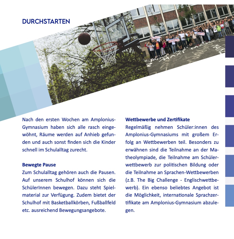 Im Übrigen zeigen die guten Ergebnisse, die unsere Schüler:innen bei zentralen Prüfungen erreichen, dass das Amplonius-Gymnasium gut aufgestellt ist.